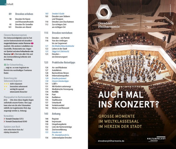 Dieser aktuelle Stadtführer ist der ideale Begleiter, um alle Seiten sächsischen Kulturmetropole Dresden selbstständig zu entdecken: Die wichtigsten Sehenswürdigkeiten und Museen der Stadt sowie weniger bekannte Attraktionen und Viertel ausführlich vorgestellt und bewertet - Faszinierende Architektur zwischen barockem Pomp und Deutschlands erster Gartenstadt Hellerau - Abwechslungsreiche Stadtspaziergänge durch die interessantesten Viertel- Erlebnisvorschläge für ein langes Wochenende und darüber hinaus - Shoppingtipps vom traditionellen Kunsthandwerk bis zu edlen Tropfen der Weingüter - Die besten Lokale der Stadt und allerlei Wissenswertes über die sächsische Küche - Die pulsierende Klub - und Musikszene von angesagten Kneipen bis zu Ballsälen - Mit Ausflügen nach Meißen und Pirna, zum Schloss Moritzburg und zur Festung Königstein - Ausgewählte Unterkünfte von preiswert bis ausgefallen - Detaillierte und verlässliche Reisetipps: Anreise, Preise, Stadtverkehr, Touren, Events, Hilfe im Notfall ... - Hintergrundartikel mit Tiefgang: Geschichte, Mentalität der Bewohner, Leben in der Stadt ...- CityAtlas im Buch zusätzlich zu den praktischen Übersichtskarten und dem herausnehmbaren City-FaltplanDazu: kostenlose Web-App für Smartphone, Tablet und PC mit Stadtplan- und Satellitenansichten passend zum Text, Routenführung zu allen beschriebenen Sehenswürdigkeiten, Verlauf der Stadtspaziergänge, seitenbezogenen Updates nach Redaktionsschluss sowie einem Mini-Audiotrainer Sächsisch.