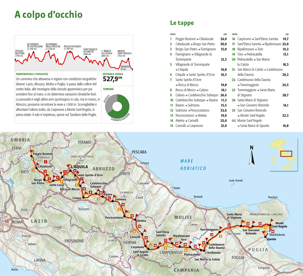 Te voet of met de fiets in het spoor van de heilige Franciscus en daarnaast met speciale aandacht voor de heilige Michaël de aartsengel. Van de heilige berg tot de heilige berg (van La Verna naar Monte Sant'Angelo). Een spannende route die Abruzzo, Molise en Noord-Puglia doorkruist, tussen onbekende valleien, kunststeden en adembenemende landschappen. De tot de verbeelding sprekende grot van de verschijningen en van de cultus van San Michele, op enkele kilometers van San Giovanni Rotondo, wordt natuurlijk niet gemist. Voor elke etappe vanuit Lazio in de richting van Monte Sant'Angelo, de rotspunt die is 'opgehangen' boven de zee van Gargano, vindt u in deze gids gedetailleerde beschrijvingen van de route, kaarten (1: 50.000), slaapplaatsen en waar je kunt eten. Ook alle bezienswaardige plaatsen, tradities en historische documenten over St. Franciscus en de Aartsengel Michael komen aan bod. Italiaanstalig!