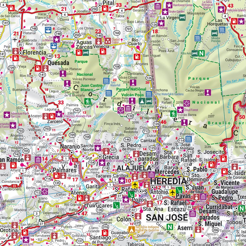 Kaarten en gidsen > Kaarten & plattegronden > Landkaarten en wegenkaarten > Midden-Amerika (met Mexico), Caribisch Gebied > Midden-Amerika > Honduras, El Salvador, Nicaragua, Costa Rica, Panama > Costa Rica > Costa Rica | autokaart, wegenkaart 1:400.000
