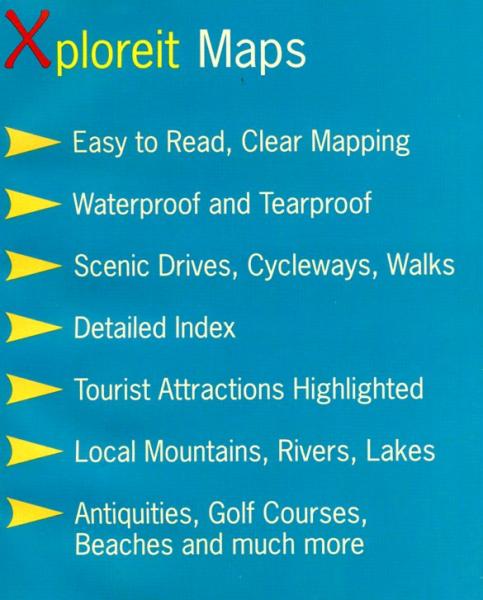 Scheur- en watervaste kaart, met autoroutes, fietsroutes en wandelpaden. Topografie wordt aangegeven met behulp van 30m hoogtelijnen waarbij bosrijke gebieden, bergen, rivieren en meren duidelijk gemarkeerd zijn. Een brede waaier van symbolen toont antiquiteiten, golfbanen, musea, erfgoed centra, toeristische informatiepunten, stranden waar men kan surfen en zwemmen, campings, caravanparken en vele andere lokale bezienswaardigheden. Met plaatsnamenregister; coördinatenstelsel gebaseerd op lengte-en breedtegraden met intervallen van 5' en 10'. Meerdere kaarten uit deze serie hebben een centrumplan van de belangrijkste provinciestad.