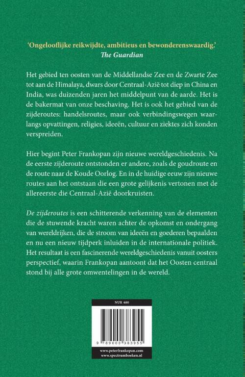 De zijderoutes is een schitterende verkenning van de elementen die de stuwende kracht waren achter de opkomst en de ondergang van wereldrijken, die de stroom van ideeën en goederen bepaalden en nu een nieuw tijdperk inluiden in de internationale politiek.Het gebied ten oosten van de Middellandse en de Zwarte Zee tot aan de Himalaya, dwars door Centraal-Azië tot diep in China en India, was duizenden jaren het middelpunt van de aarde. Het is de bakermat van onze beschaving, waar meer dan 2500 jaar v.Chr. metropolen ontstonden als Harappa en Mohenjodaro met een bevolking die in de tienduizenden liep en met straten die waren aangesloten op een geavanceerd rioleringssysteem. Het is ook het gebied van de zijderoutes – handelsroutes maar ook verbindingswegen waarlangs opvattingen, religies, ideeën, cultuur én ziektes zich konden verspreiden.Hier begint Peter Frankopan zijn nieuwe wereldgeschiedenis. Na de eerste zijderoutes ontstonden er andere: de slavenroute, de goudroute, de route naar het zwarte goud. Maar in onze eenentwintigste eeuw zijn nieuwe routes aan het ontstaan die een grote gelijkenis vertonen met die allereerste, die Centraal-Azië doorkruisten. De zijderoutes komen terug! Peter Frankopan studeerde geschiedenis in Cambridge. Hij is sinds 2000 Senior Research Fellow en directeur van The Centre for Byzantine Research aan de universiteit van Oxford. Eerder schreef hij De eerste kruistocht.The Economist – 'Briljante verhaallijnen (...) Een wereldgeschiedenis die het middelpunt van die wereld naar het oosten verplaatst.' 750 blz.