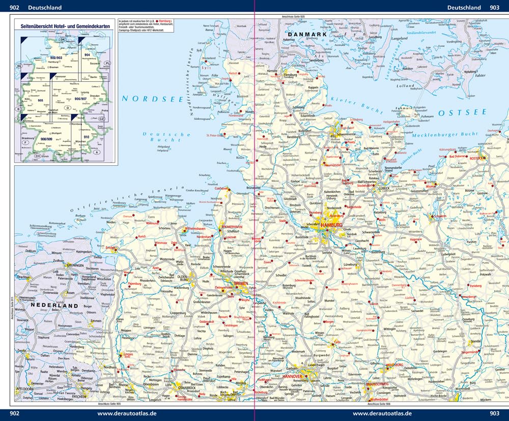 Ook het gedeelte met de reiskaarten is aantrekkelijk en toont alle belangrijke landen in Europa op de meest ideale schaal voor het betreffende land. In de belangrijkste grote steden in Duitsland en Europa kunt u gemakkelijk uw weg vinden met de transit- en stadsplattegronden. Belangrijke informatie voor reizen in binnen- en buitenland vindt u ook in een informatieve rubriek: ADAC-service, reisinformatie voor alle Europese landen, taalgidsen voor reizen en nog veel meer. Advertenties van hotels en restaurants zijn ook opgenomen in dit toeristische gedeelte. De praktische structuur en de duidelijke, beschrijvende kleurengids en de uitgebreide index voor Duitsland en Europa leiden u zo snel mogelijk naar uw bestemming.