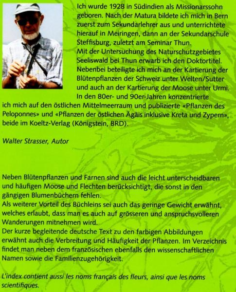 Pflanzen bestimmen nach Zeichnungen. In diesem Buch für interessierte Laien, sind die Blüten nach Farbe geordnet, fast alle Blütenpflanzen, Farne, Moose und Flechten der oberen Nadelwaldstufe bis zur Schneeregion finden sich hier. Der kurze begleitende deutsche Text zu den farbigen Abbildungen erwähnt auch die Verbreitung und Häufigkeit der Pflanzen.