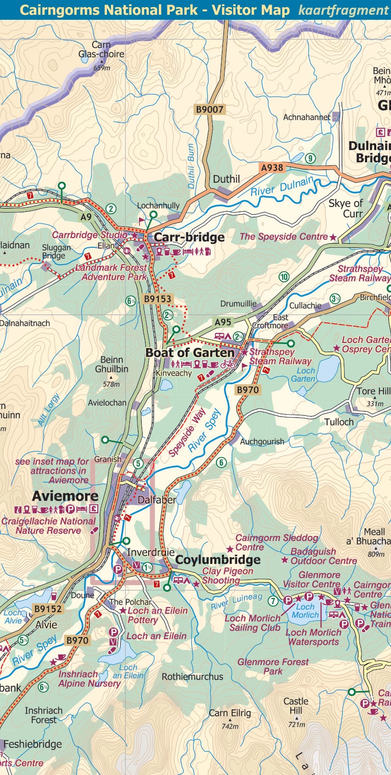 Kaarten en gidsen > Kaarten & plattegronden > Landkaarten en wegenkaarten > Europa > Britse Eilanden > Groot-Brittannië > Schotland > de Schotse Hooglanden (ten noorden van Glasgow / Edinburgh) > Discover Cairngorms National Park | Visitor Map 1:120.000