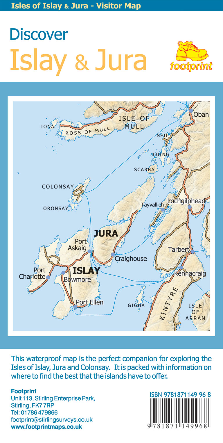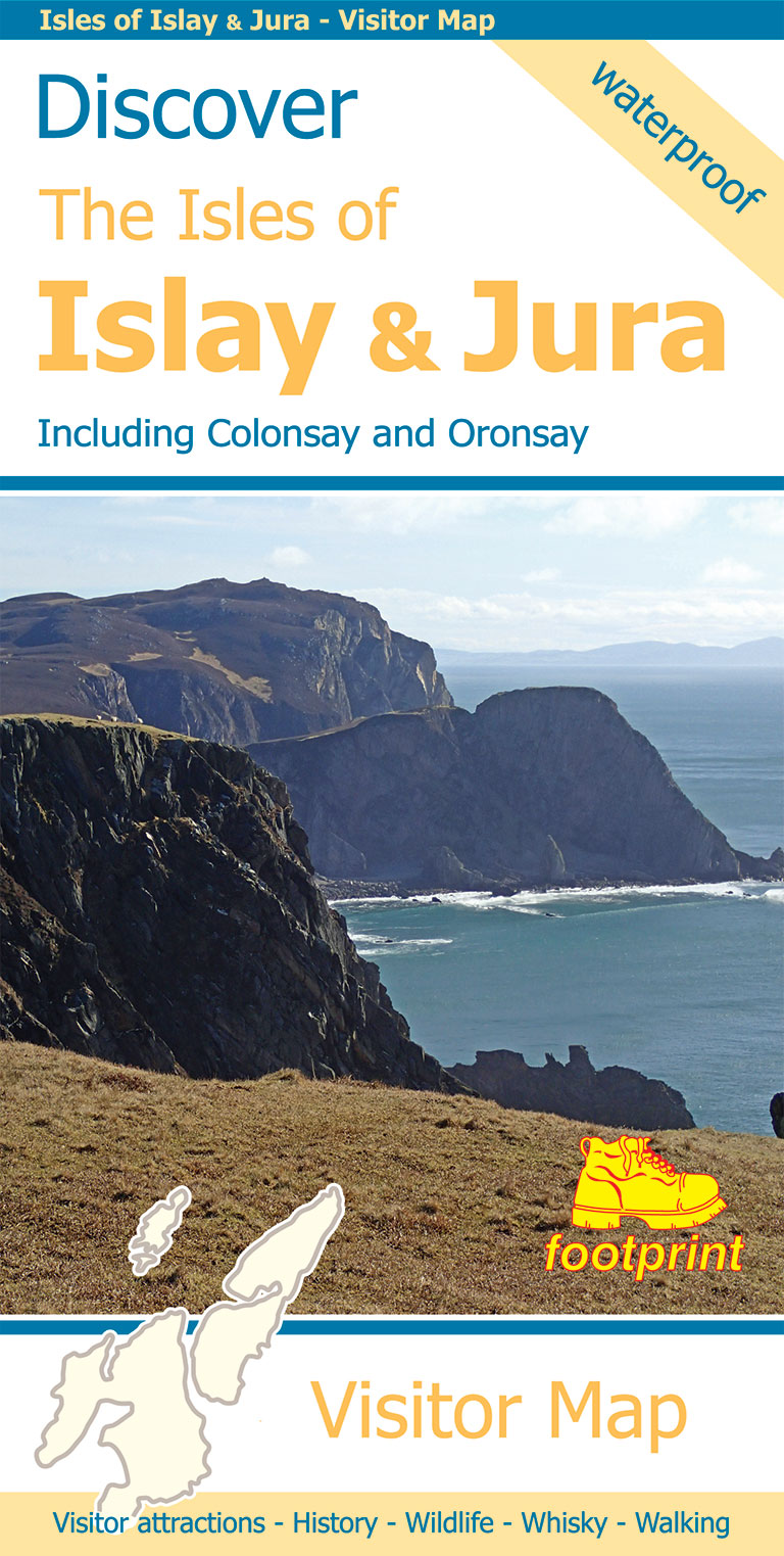 A visitors map (printed on waterproof paper) of two spectacularly different islands. Islay, known as the Queen of the Hebrides, is populous, fertile and hilly. Famed for the numerous whisky distilleries, the island also boasts beautiful beaches and coves, picturesque villages, numerous ancient ruins and a wide variety of wildlife.