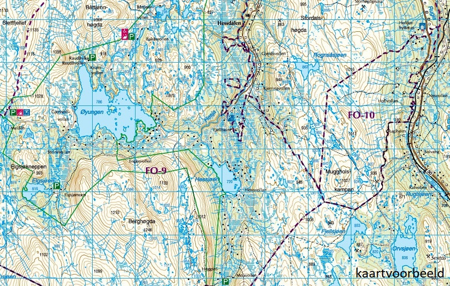 Deel uit een serie Noorse top. wandelkaarten, met variërende schalen, maar altijd bedoeld als wandelkaart (soms als skikaart). Omdat het gebied zo dunbevolkt is, voldoet de schaal 1:100.000 prima als wandelkaart, alle routes en hutten staan er duidelijk op.