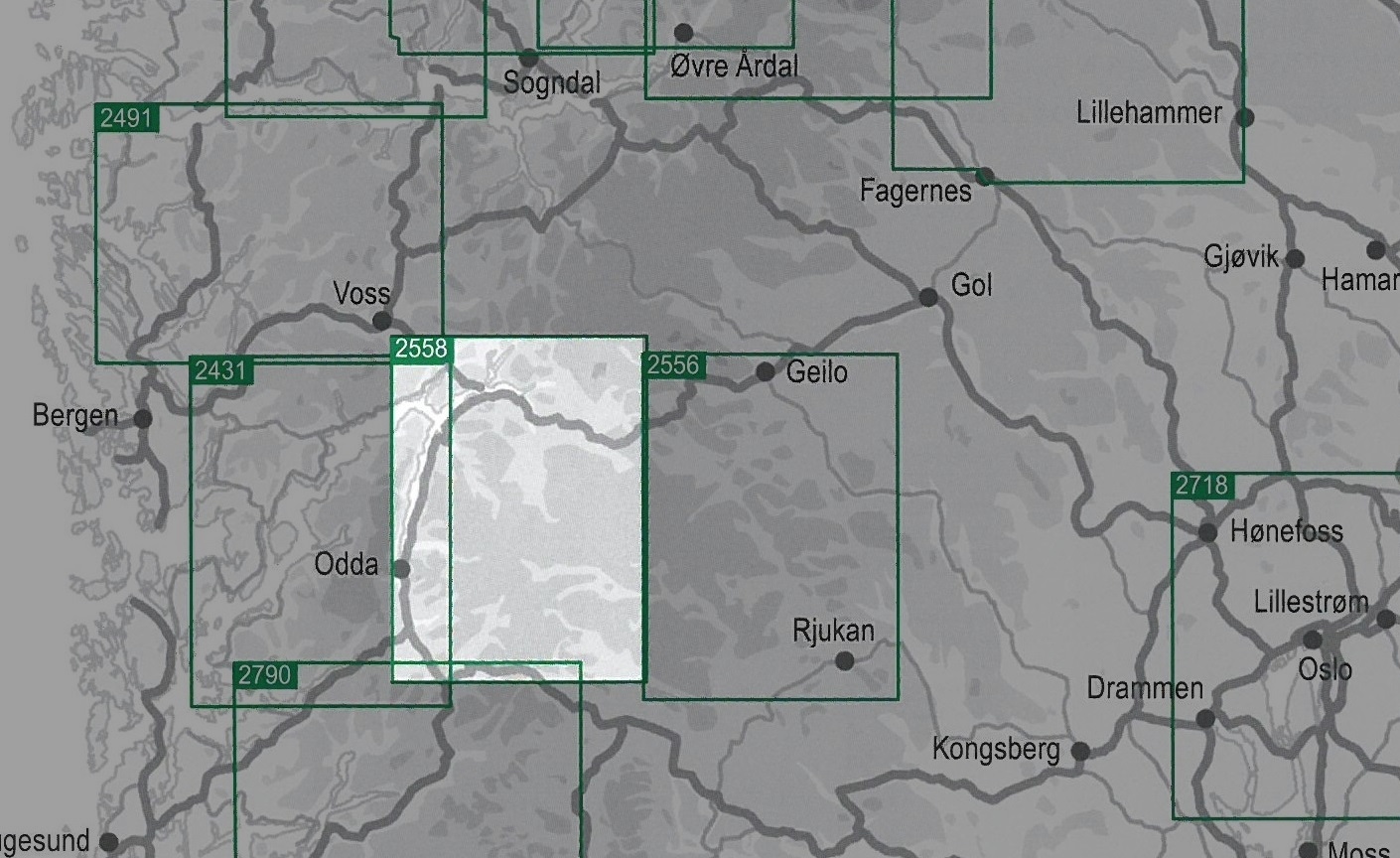 Kaarten en gidsen > Wandelen > Wandelkaarten > Europa > Scandinavië (& Noordpool) > Noorwegen > Zuid-Noorwegen > DNT-2558 Hardangervidda Vest wandelkaart 1:100.000