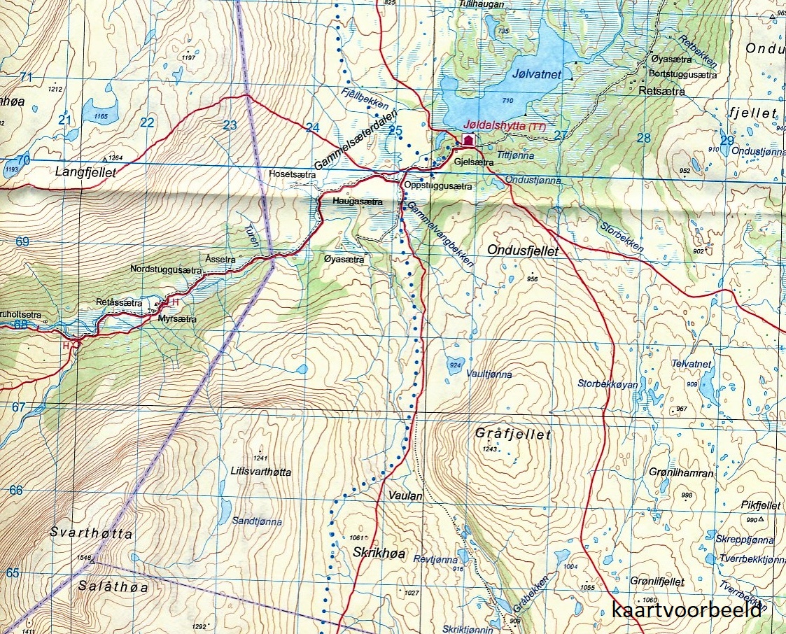 Perfecte wandelkaart voor dit stukje Noorwegen, bevat alle noodzakelijke info: bemande en onbemande hutten, campings, rivier-oversteken, wandelroutes en vaak ook ski- en langlaufroutes; daarnaast natuurlijk de topografische details als hoogtelijnen, grondgebruik, bebouwing, wegen en paden. Met UTM grid. De legenda is in het Noors en Engels, verdere informatie op de achterzijde van de kaart is in het Noors. Gedrukt op superlicht en ijzersterk materiaal.