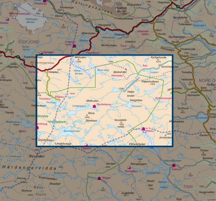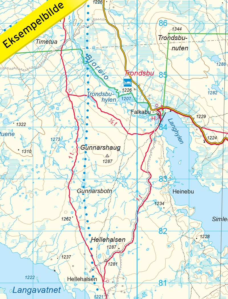 Perfecte wandelkaart voor dit stukje Noorwegen, bevat alle noodzakelijke info: bemande en onbemande hutten, campings, rivier-oversteken, wandelroutes en vaak ook ski- en langlaufroutes; daarnaast natuurlijk de topografische details als hoogtelijnen, grondgebruik, bebouwing, wegen en paden. Met UTM grid. De legenda is in het Noors en Engels, verdere informatie op de achterzijde van de kaart is in het Noors. Gedrukt op superlicht en ijzersterk materiaal.