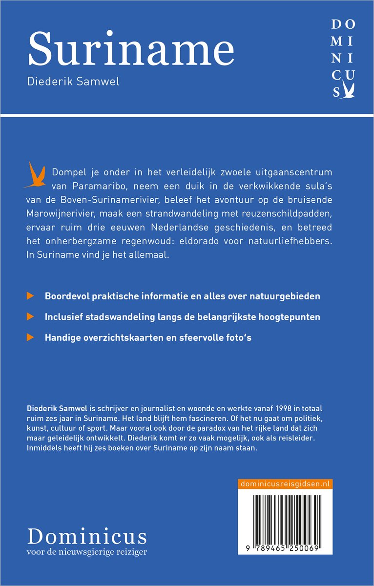 Gemoderniseerde gidsen met adequate beschrijvingen van wat een land of gebied te bieden heeft voor de geinteresseerde bezoeker, zonder te blijven steken bij de meest voor de hand liggende trekpleisters. Incl. plattegrondjes, illustraties en een beknopte selectie aan praktische verblijfsdetails. | De ongerepte natuur, verschillende bevolkingsgroepen, de zeer interessante geschiedenis en uiteraard de bijzondere band met Nederland. Suriname heeft de avontuurlijke reiziger veel te bieden. Naast het bruisende leven in Paramaribo is er een heel land te ontdekken. In deze geheel nieuwe reisgids voor Suriname laat Diederik Samwel je kennismaken met deze bijzondere bestemming. Hij voert de lezer mee diep de binnenlanden in en beschrijft het land op een informatieve, maar verhalende manier. Diederik Samwel is journalist en woonde jarenlang in Suriname.