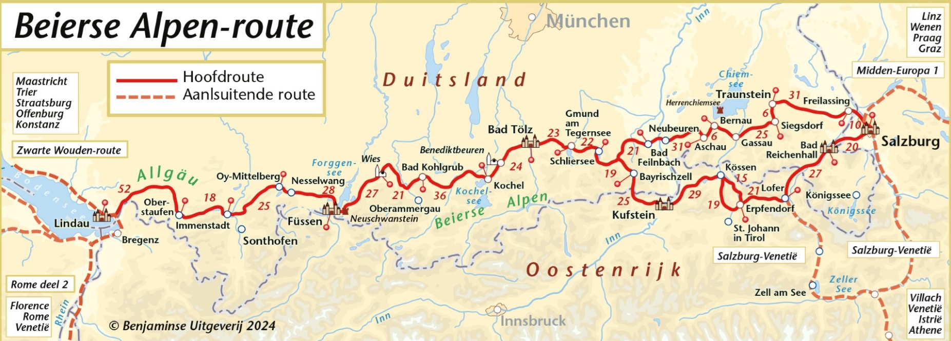 Deze route van de Bodensee naar Salzburg is een vervolg op de Zwarte Wouden-route. De route volgt voor een groot deel de populaire Bodensee-Königssee-route, langs de rand van de Beierse Alpen. De route voert langs veel mooie bergmeertjes, door groene Alpenweiden, gezellige dorpjes en langs indrukwekkende monumenten zoals het kasteel van Neuschwanstein en het barokke kerkje van Wies. Salzburg is een mooi einddoel met prima treinverbindingen. Tevens is Salzburg het begin van de vervolgroutes naar Wenen, Karinthië, Venetië en Istrië.