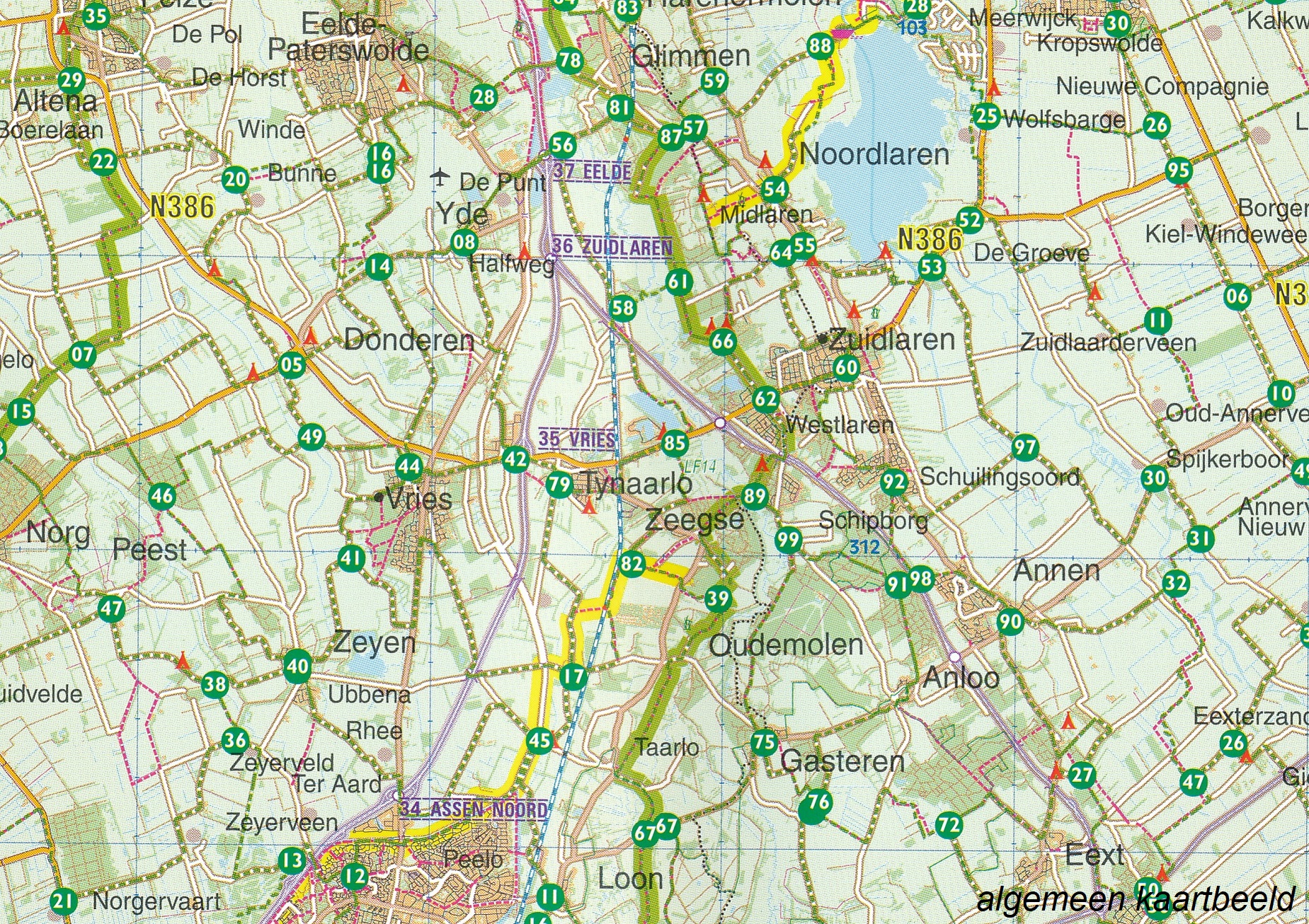 Gedetailleerde fietskaart, gedrukt op scheurvast en watervast materiaal. Intekening van alle fietsknooppunten met verbindingen en LF-routes.