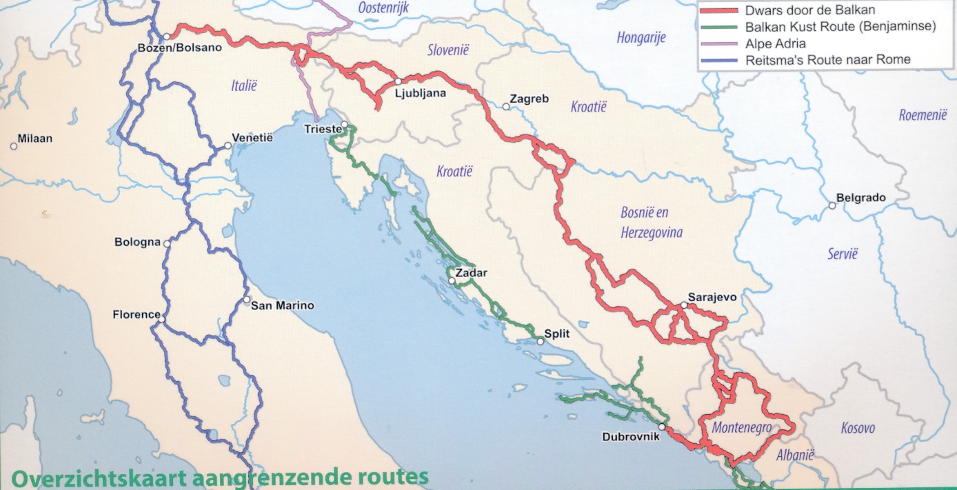 De route gaat door bergen van Montenegro, Albanië, Bosnië en Herzegovina, Slovenië en Noord Italië, door laagland in Montenegro, hoogvlakte in midden Bosnië en Herzegovina en vlak rivierenland in Kroatië. De route biedt veel afwisseling in de prachtige landschappen, afwisselende culturen, ervaringen met mensen die verlangen naar vrede en vooruitgang. De bergen van de Balkan zijn pittig. De route heeft een lengte van rond de 1700 km en in het boekje zijn 8 alternatieven/varianten opgenomen.
