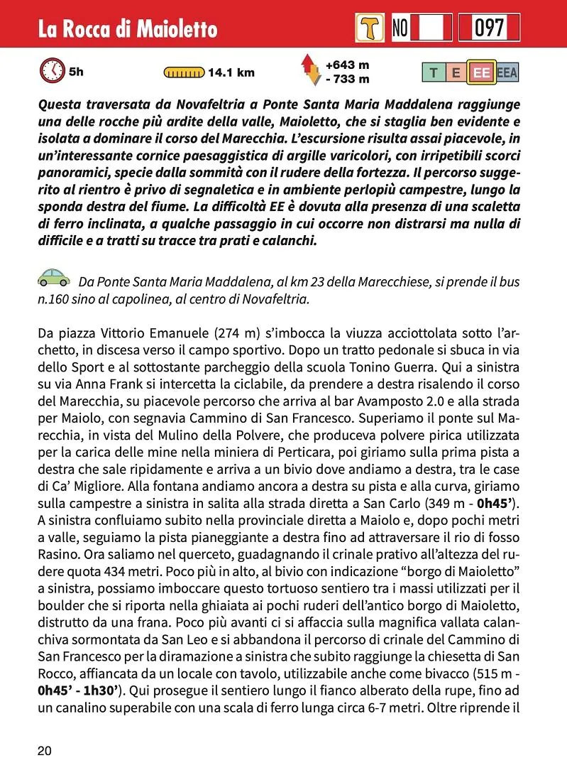Map and hiking guide no. 95 of the "Carte dell'Escursionista" series. It covers the middle Valmarecchia area, from Torriana and Verucchio to Mercato Saraceno and Sant'Agata Feltria. The map is printed on tear-resistant, waterproof, and eco-friendly paper, and all trails (both marked and unmarked) have been recorded using GPS satellite equipment. The map design (coloring and symbols) follows the graphic design recommended by the CAI (Italian Alpine Club) and was created and geo-referenced using the most modern techniques available, including satellite imagery. The full-color hiking guide in italian contains eight recommended routes and all marked trails in the area, including travel time, length, elevation gain, and difficulty level. An indispensable tool to complement the map, it allows anyone, even the less experienced, to customize any itinerary to their abilities and expectations. It also includes nine mountain bike routes, marked on the map and with elevation charts.