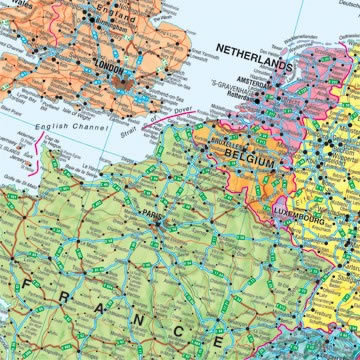 Mooie, grote (!), geplastificeerde wandkaart van Europa. Staatkundig, dus de landen zijn duidelijk van elkaar te onderscheiden. 170x124cm. | Maps International’s European political wall map is huge! Our European political wall map is the size of a Smart Car and is the largest single sheet map available to buy. European Map details: Politically coloured wall map of Europe features countries marked in a different colour, with international boundaries shown. All major towns and cities of Europe are featured within our huge map, and the country's capital cities are clearly marked. The map contains hill and sea shading adding to the vibrant overall effect. The wall map also contains a section showing the different flags of countries in Europe. Map uses: As with most of our maps, the huge Europe political wall map is available in a variety of finishes making it suitable for the home, office or classroom. Just select your desired map finish from the options on the right. If you are looking to buy a map of Europe, you won't be disappointed with this huge, stunning wall map.