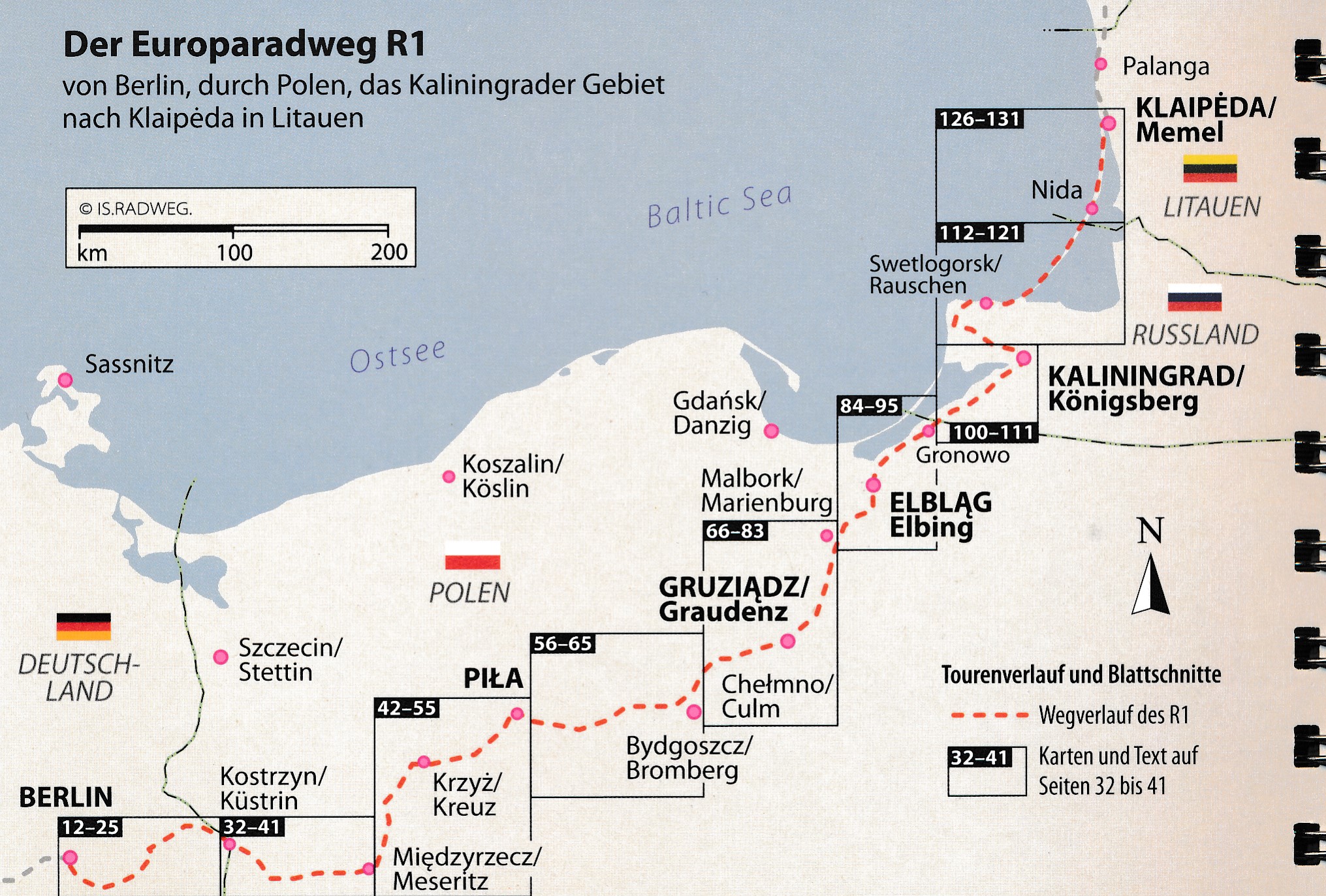 De gids (in spiraalband) toont en beschrijft de route van de Europese fietsroute R1 van Berlijn door Polen, Kaliningrad naar Klaipeda (Litouwen).De fietsgids biedt alles wat u nodig heeft voor een zorgeloze langeafstandsfietstocht op de R1: 1. kaarten / routebeschrijvingen 1:125.000 met gedetailleerde oversteekkaarten door steden en gemeenten. 2. diverse extra rondleidingen, bijv. naar Kasteel Marienburg. 3. route-informatie en korte beschrijvingen van de bezienswaardigheden langs de route. 4. hoogteprofielen, tips voor routeplanning. 5. adressen en links van toeristische informatie, fietsreparatievoorzieningen, hotels, pensions en campings, evenals de trein- en veerbootverbindingen met aankomst- en vertrektips van/naar Klaipeda. Het gidsje bevat de GPS tracks van de oorspronkelijke route en diverse extra routes. Deze kunnen worden overgezet naar outdoor GPS-apparaten of smartphones voor navigatie onderweg. Er zijn ook routepunten (POI's) voor overnachtingen, toeristische informatie, fietsreparatie, sightseeing en vervoersverbindingen. De tracks en waypoints kunnen na voorafgaande registratie worden gedownload van het internet.