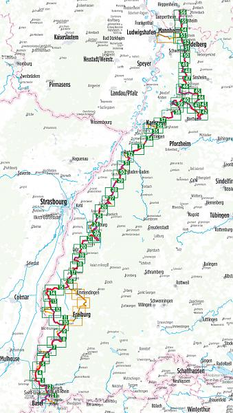 De Badischer Rheinradweg loopt over een afstand van ongeveer 470 kilometer door zeven van de negen wijnbouwgebieden van Baden. Vanuit Basel fietst u eerst door het schilderachtige Markgräflerland met zijn zacht glooiende heuvels en geniet u vervolgens van het mediterrane klimaat op het zonnige terras van de vulkaanmassieven Kaiserstuhl en Tuniberg. Een variant van de tocht loopt dwars door de regio Breisgau en zijn mooie hoofdstad Freiburg. In de uitlopers van Ortenau kunt u enkele van Baden's oudste wijnmakerijen bezoeken en ervaren waarom de Kraichgau ook wel het "Land van 1000 heuvels" wordt genoemd. Geniet tenslotte van de afsluiting van uw fietstocht in Duitslands lentetuin op de Badische Bergstraße. De voortdurende stijgingen en dalingen door de wijngaarden brengen niet alleen prachtige uitzichten, maar ook bijna 3000 meter gecumuleerde hoogte - het fietspad is dus voorbestemd voor e-bikes.