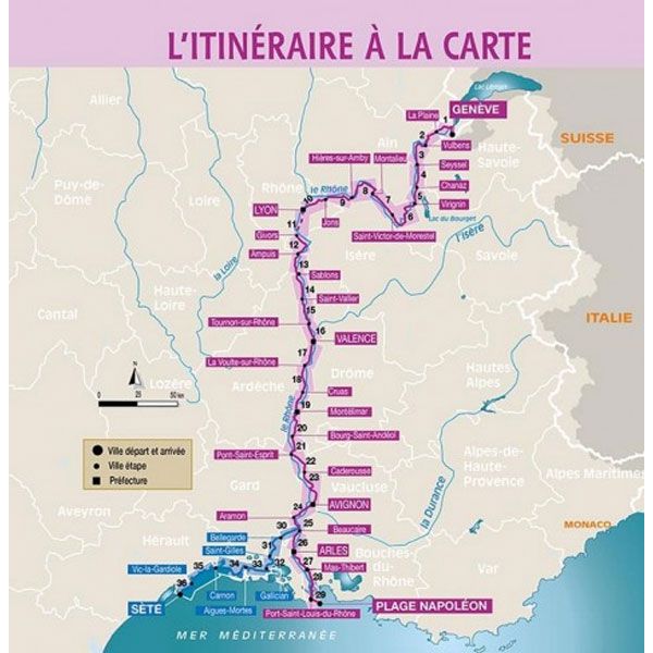 830 km prachtig fietsen van Saint-Cingolph (Zwitserland) aan de oevers van het meer van Genève naar de Camargue en Sète, 38 etappes volledig voor fietsers gemarkeerd.