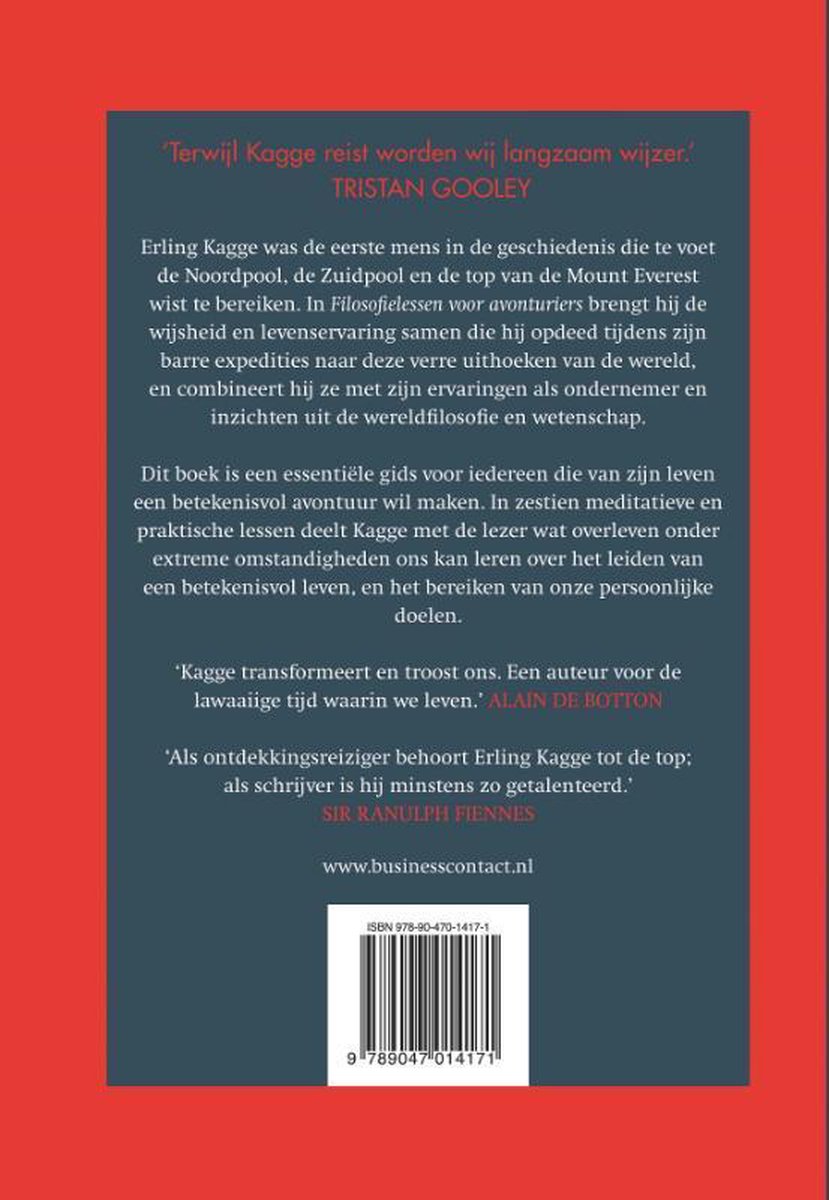 Erling Kagge brengt in 'Filosofielessen voor avonturiers' de wijsheid en levenservaring samen die hij opdeed als eerste mens in de geschiedenis die te voet de Noordpool, de Zuidpool en de top van de Mount Everest bereikte. Zijn ervaringen die hij opdeed tijdens de barre expedities naar deze verre uithoeken van de wereld, combineert hij in dit boek met zijn ervaringen als ondernemer en inzichten uit de wereldfilosofie en wetenschap.