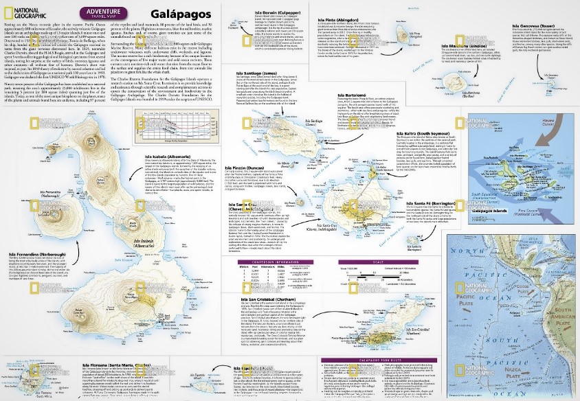 Gelegen op de Nazca tektonische plaat in de oostelijke Stille Oceaan, ongeveer 600 mijl ten westen van Ecuador, werden de actieve vulkanische Galápagoseilanden in 1535 ontdekt door de bisschop van Panama, Tomás de Berlanga, toen zijn schip uit koers dreef. In 1835 arriveerde de naturalist Charles Darwin, aan boord van de H.M.S. Beagle, in de Galápagos en bracht 5 weken door met het verzamelen van geologische en biologische exemplaren van verschillende eilanden, waarbij hij zijn verbazing uitsprak over de verscheidenheid aan vogels, schildpadden, leguanen en andere dieren - allemaal zonder angst voor mensen. Darwin's korte bezoek inspireerde hem deels tot zijn 1859 evolutietheorie door natuurlijke selectie en leidde 100 jaar later, in 1959, tot de uitroeping van Galápagos als nationaal park. Galápagos werd in 1978 uitgeroepen tot het eerste UNESCO-werelderfgoed. Nu heeft National Geographic een kaart gemaakt van deze eilandengroep die zo afgelegen is dat veel van de soorten die hier leven nergens anders op aarde te vinden zijn. De voorkant van de kaart bevat een overzicht van de gehele archipel, aangezien de eilanden verspreid zijn over een groot deel van de oceaan. Op de achterkant van de kaart heeft elk groot eiland een beschrijving van de endemische soorten (dieren of planten die alleen op de Galápagos leven), gegevens omtrent de menselijke geschiedenis van elk eiland, en andere feiten die belangrijk zijn voor reizigers. Elke Adventure Map is gedrukt op duurzaam synthetisch papier, waardoor ze waterdicht, scheurvast en sterk zijn - en bestand tegen intensief gebruik.