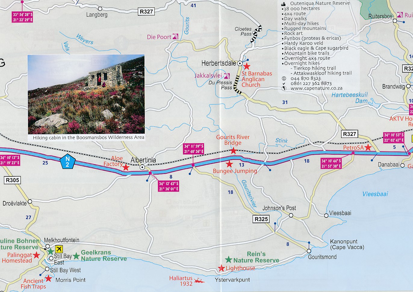 Detailed exploring map of the Garden Route from Riversdale to Jefferys Bay. Route 62 from Montagu to Jefferys Bay.