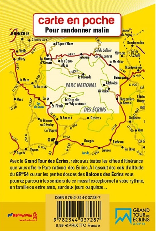 Met deze kaart vind je alles wat het Nationaal Park van de Écrins te bieden heeft. Van de hoge passen van de GR54 tot de glooiende hellingen van de Balcons des Écrins, je kunt de paden van dit uitzonderlijke massief in je eigen tempo verkennen, of je nou twee dagen of twee weken gaat... De GR54 is een uitnodiging om een uniek landschap en een uitzonderlijke, beschermde flora en fauna te ontdekken.