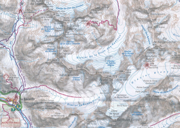 Deze kaart presenteert de routes en geeft handige contactgegevens voor het organiseren van je verblijf: In de voetsporen van de pioniers leidt alleen deze route naar de voet van de legendarische toppen van de Zuidelijke Alpen: La Meije, de Barre des Écrins en Le Sirac. Met 190 af te leggen kilometers, 14 passen en 12.000 stijgingsmeters is dit een sportieve route voor geoefende bergwandelaars. De route werd in 1965 gecreëerd en ligt grotendeels in het hart van het Parc National des Ecrins.