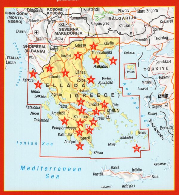 Relatief bijzonder gedetailleerde kaart over het gehele land, m.u.v. Kreta en de eilanden voor de Turkse kust. Heldere cartografie, tweetalig (Grieks en Latijns schrift), afstandentabel en plaatsnamenregister.