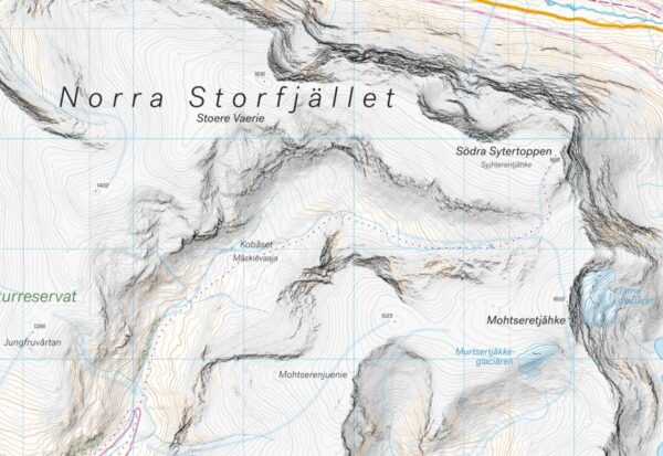 Dit is een unieke kaart met een schat aan details die nog nooit eerder bestond in het gebied rond Hemavan en Sytertopparna. De terreininformatie op de kaart is gebaseerd op laserscanning vanuit de lucht. Voor het eerst verschijnen kliffen, grotere rotsen, bossen en beekjes met een nauwkeurigheid die echt overeenkomt met de werkelijkheid. De huidige omvang van de gletsjers is ontwikkeld in samenwerking met de afdeling Natuurlijke Geografie van de Universiteit van Stockholm.Een kaart in schaal 1:25 000 biedt goede ondersteuning voor degenen die bergwandelingen, gletsjerwandelingen maken of anderszins de gemarkeerde paden van de valleien verlaten en nieuwe routes op grotere hoogte proberen.We zijn tot de conclusie gekomen dat Tyvek® het beste materiaal voor een kaart is. Het is gemaakt van een synthetische vezel die de kaart volledig ongevoelig maakt voor water en zeer scheurvast. Een Tyvekkaart is scheurbestendig en kleurvast.