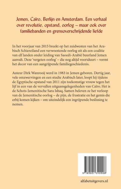 In het voorjaar van 2015 breekt op het zuidwesten van het Arabisch schiereiland een verwoestende oorlog uit als een coalitie van elf landen onder leiding van Saoedi-Arabië buurland Jemen aanvalt. Deze 'vergeten oorlog' - die nog altijd voortduurt - vormt het decor van een aangrijpende familiegeschiedenis. Auteur Dirk Wanrooij werd in 1983 in Jemen geboren. Dertig jaar, vele omzwervingen en een studie Arabisch later, loopt hij tijdens de Egyptische opstand van 2011 zijn toekomstige vrouw tegen het lijf in een van de vervallen uitgaansgelegenheden van de Egyptische hoofdstad. Het is de Schots- Jemenitische Sara Ishaq. Samen beleven ze het verloop van de Jemenitische oorlog - de pijn, de frustratie en het gemis die daarbij komen kijken - om uiteindelijk een ingrijpende beslissing te nemen.