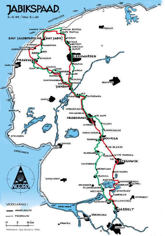 Het Jabikspaad is veelzijdig: het is een aaneenschakeling van geschiedenissen van de mensen die Noord-Nederland gemaakt hebben tot wat het nu is. Het pad begint in Sint-Jacobiparochie dat zo’n 500 jaargeleden werd gesticht op een plaats waarvan Plinius naar huis schreef: “een erbarmelijk land, waar de bewoners wonen op terpen waar zij in hun hutten hun verstijfde ledematen verwarmen aan een vuur van gedroogd slik”. Het pad eindigt bij de deftige koopmanshuizen in het prachtige hanzestadje Hasselt.Het Jabikspaad loopt zowel door gebieden waar de veeteelt verheven is tot de hoogste productie ter wereld als door het veenplassengebied ten zuiden van de Linde, waar de oudste comfortabele dakbedekking nog steeds wordt geteeld en gekoesterd. Het Jabikspaad loopt ook nog eens door drie taalgebieden.Het Jabikspaad is geïnitieerd op de geschiedenis van de eerste boeteling die vanuit Friesland ter pelgrimage werd gestuurd. Het Jabikspaad is een op zichzelf staande route, maar kan voor u de eerste stap zijn op weg naar een hoger doel. Voor fietsers zijn het 130 km, voor de wandelaars zo’n 20 kilometers meer.De route is, ter ondersteuning van beschrijving en kaart, in het veld gemarkeerd.Routes in kleur aangegeven.
