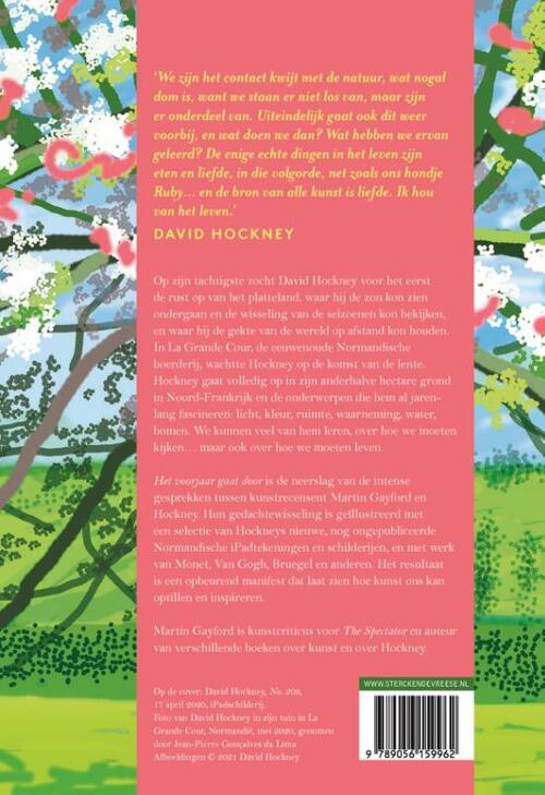 Op zijn tachtigste zocht David Hockney voor het eerst de rust op van het platteland, waar hij de zon kon zien ondergaan en de wisseling van de seizoenen kon bekijken, en waar hij de gekte van de wereld op afstand kon houden. In La Grande Cour, de eeuwenoude Normandische boerderij, wachtte Hockney op de komst van de lente. Hockney gaat volledig op in zijn anderhalve hectare grond in Noord-Frankrijk en de onderwerpen die hem al jaren¬lang fascineren: licht, kleur, ruimte, waarneming, water, bomen. We kunnen veel van hem leren, over hoe we moeten kijken… maar ook over hoe we moeten leven. Het voorjaar gaat door is de neerslag van de intense gesprekken tussen kunstrecensent Martin Gayford en Hockney. Hun gedachtewisseling is geïllustreerd met een selectie van Hockneys nieuwe, nog ongepubliceerde Normandische iPadtekeningen en schilderijen, en met werk van Monet, Van Gogh, Bruegel en anderen. Het resultaat is een opbeurend manifest dat laat zien hoe kunst ons kan optillen en inspireren. Martin Gayford is kunstcriticus voor The Spectator en auteur van verschillende boeken over kunst en over Hockney.