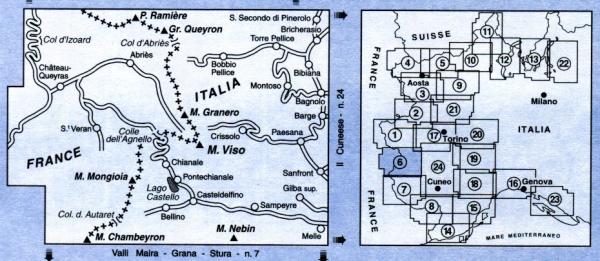 Topografische wandelkaart met ingetekende routes en hutten. Omvat de gebieden: Valle Pellice - Po Valley - Valle Varaita - Bellino - Bobbio Pellice - Col Agnel - Crissolo - Paesana - Pontechianale - Sampeyre - Torre Pellice.