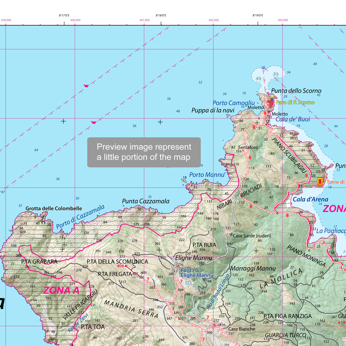 The official map of the National Park-Marine Reserve of Asinara Island, Sardinia; it includes 10 suggested hiking tours highlighted and described in the back of the map in Italian and English. All trails, roads and points of interest were recorded in the field using GPS devices. It is designed for both, mountainbikers and hikers. The map is printed on both sides, on one side there is the hiking map on the back side the 10 suggested tours. Printed on Polyart a Tear-resistant, Waterproof and Recyclable material.