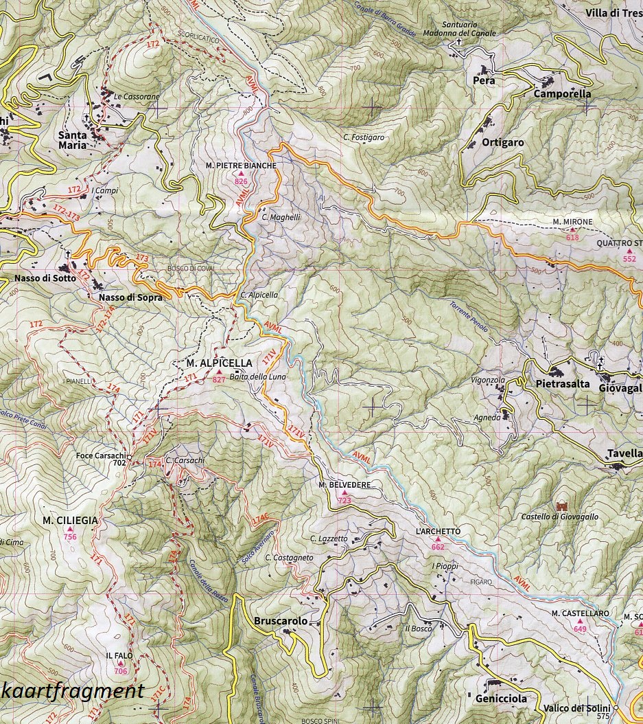 Meer dan 2.000 km aan paden zijn met GPS onderzocht in het veld, waarbij alle gemarkeerde paden (officiële C.A.I.-routes) en de belangrijkste lange paden die het gebied doorkruisen, zoals de Via Francigena en de Alta Via dei Monti Liguri, zijn gevolgd. Het is de ideale kaart voor trekking, Mountainbike en elke buitenactiviteit.