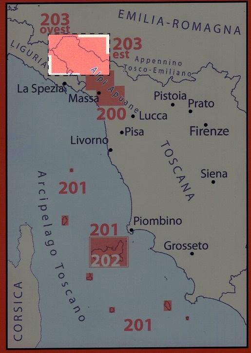 Deze set van twee kaarten (203E en 203W) bestrijkt een gebied dat zich uitstrekt over drie Italiaanse regio's: Toscane, Emilia Romagna en Ligurië. Er zijn twee kaarten, elk gedrukt aan beide zijden, die het noordoostelijke deel van het Parco dell'Appennino Tosco-Emiliano bestrijken. Het is een set van twee wandelkaarten: 203E en 203W