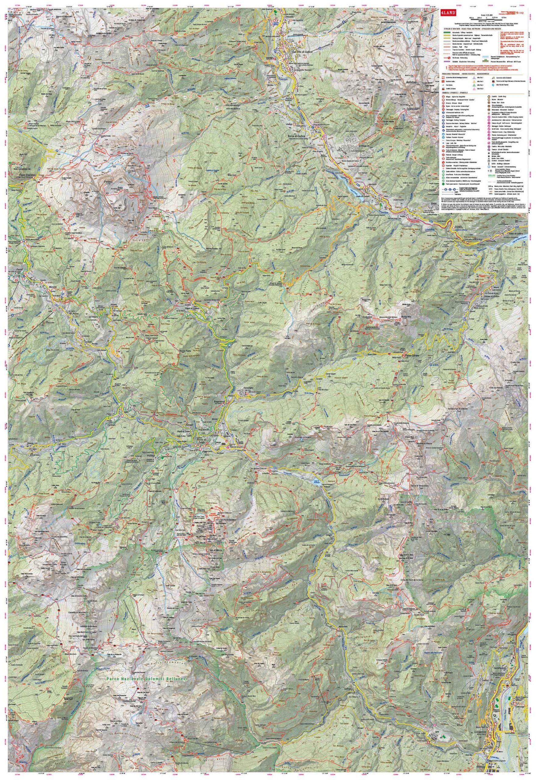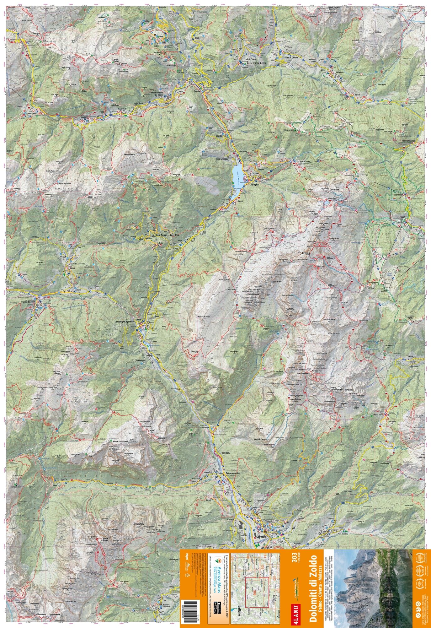 Wandelkaart van de Dolomieten van Zoldo en Agordo, voorzien van een kilometerrooster. De kaart is dubbelzijdig gedrukt op watervast en scheurvast kunststof materiaal - ideaal voor intensief gebruik in de bergen.