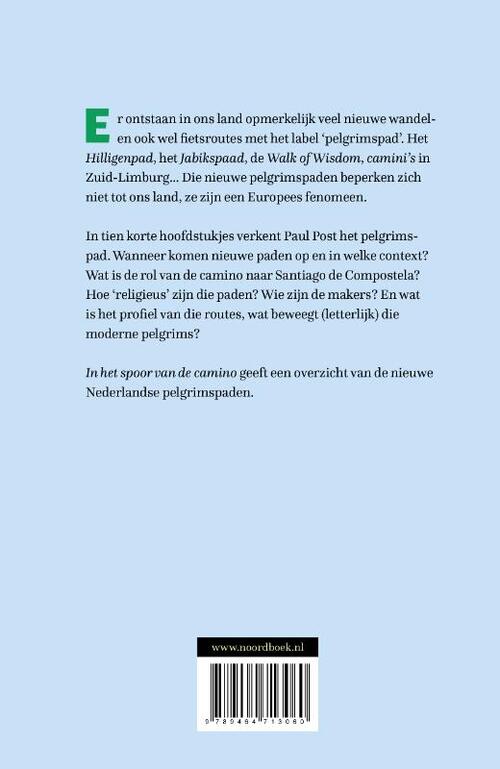 Er ontstaan in ons land opmerkelijk veel nieuwe wandel- en ook wel fietsroutes met het label 'pelgrimspad'. Het Hilligenpad, het Jabikspaad, de Walk of Wisdom, camini's in Zuid-Limburg... Die nieuwe pelgrimspaden beperken zich niet tot ons land, ze zijn een Europees fenomeen. In tien korte hoofdstukjes verkent Paul Post het pelgrimspad. Wanneer komen zulke nieuwe paden op en in welke context? Wat is de rol van de camino naar Santiago de Compostela? Hoe 'religieus' zijn die paden? Wie zijn de makers? En wat is het profiel van die routes, wat beweegt (letterlijk) die moderne pelgrims? In het spoor van de camino geeft een overzicht van de nieuwe Nederlandse pelgrimspaden.