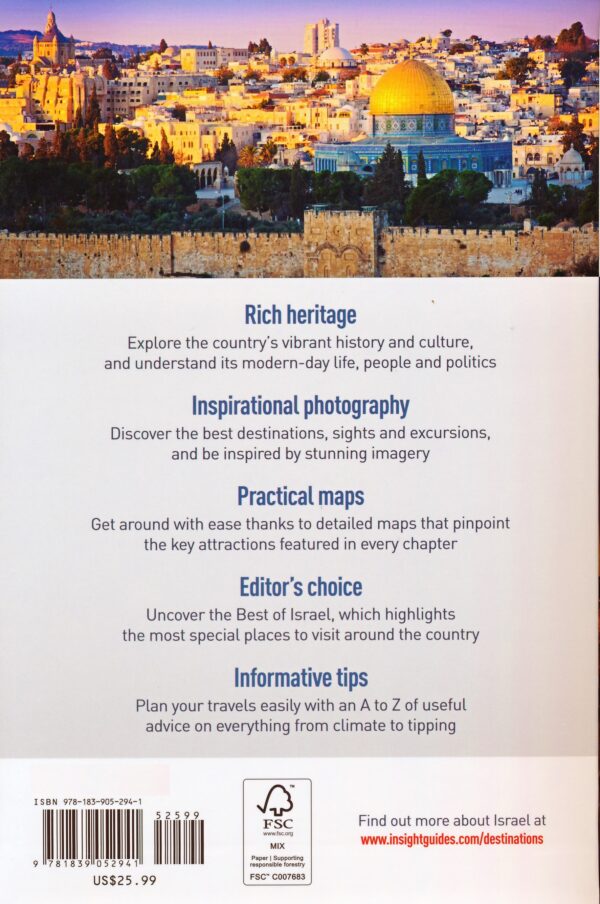 Mooi verzorgde gidsen, schitterende fotografie. Inleidende hoofdstukken met goede achtergrondinformatie over geschiedenis, cultuur, hedendaagse maatschappij. Adequate beschrijvingen van diverse plaatsen en streken op basis van hun toeristische mogelijkheden. Het aandeel praktische informatie omtrent vervoer en verblijf is relatief beknopt. Prima als voorbereiding en om later nog eens terug te kijken, en verder voor mensen die met een georganiseerde reis meegaan. | One of the world’s most fascinating countries, Israel defies indifference with its immense historical, spiritual, and contemporary significance, as well as its wealth of unique natural and cultural attractions. Whether you want to make a pilgrimage to Jerusalem’s Old City, party in fashionable Tel Aviv, bathe in the Dead Sea, or discover the country’s distinctive architecture, Insight Guide Israel will reveal the best the country has to offer.Features have been updated by a highly-regarded local writer and cover the history and peoples of Israel in depth, while also delving into topics including cuisine, conservation, and diving.Thoughtful accounts of the country’s regions bring Israel to life, from the powerful spiritual center of Jerusalem and breath-taking landscapes of the Golan Heights, to the sun-soaked beaches on the Mediterranean coast. In addition, there is detailed coverage of the West Bank’s attractions, including Bethlehem’s shrines and the Negev’s ancient sites.Full-color photography and maps help you navigate with ease, while our detailed Travel Tips give you all the practical information you need to plan your trip, including our selection of the best and most authentic hotels and restaurants.