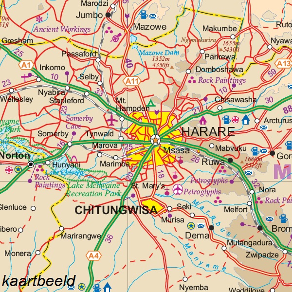 Kaarten en gidsen > Kaarten & plattegronden > Landkaarten en wegenkaarten > Afrika > Zuidelijk-Afrika > Botswana > ITM Botswana and Zimbabwe travel map | landkaart, autokaart 1:1.500.000