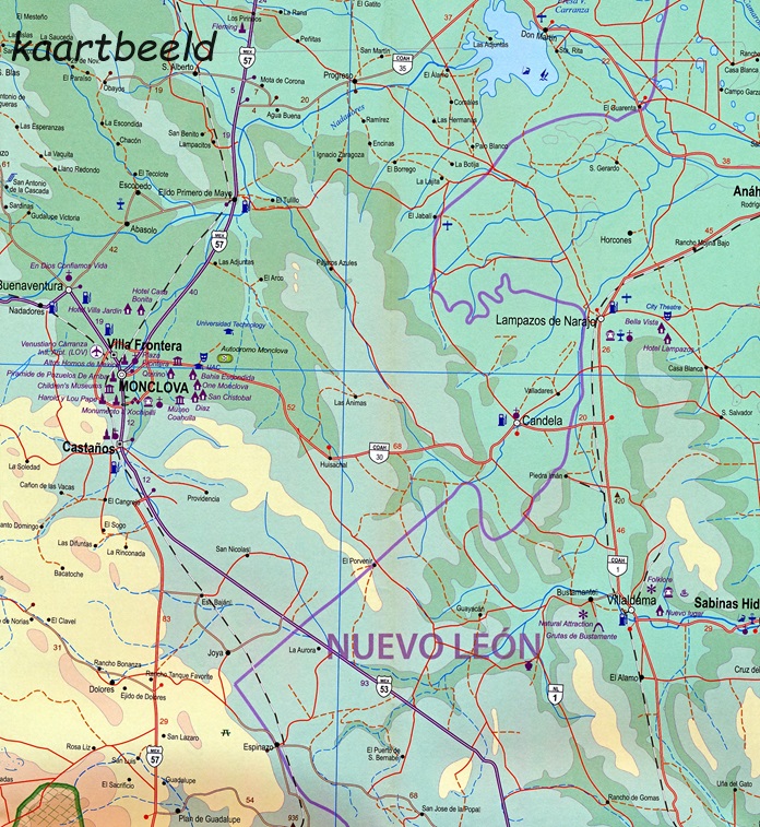 Northern Mexico is a vast desert-like plateau deeply steeped in Spanish colonial heritage. The very first settlement inside what is now the USA was the town of Presidio (long before the English thought of settling Jamestown) and is still one of the few crossings of the Rio Grande into Texas (itself a former Mexican province). There are two major cities in the region, Chihuahua, 300 kms south of El Paso, and Monterrey, the largest city in northern Mexico. There are major touristic attractions at Monclova, Saltillo, Parras, Torreon, and Cuauhtemoc, the end of the famous Copper Canyon rail line. The map extends a bit into Sinaloa, to include Los Mochis on the Pacific coastline. The entire rail line is also shown. This is an important part of North American history. It may not be as well-known to Europeans who favour the beaches of the Yucatan, but it is a fascinating part of Mexico on the American border. Ciudad Juarez, for example, is larger than its partner on the Rio Grande, El Paso. An inset map of the old colonial city of Saltillo is included, as well as our Top Attractions list.