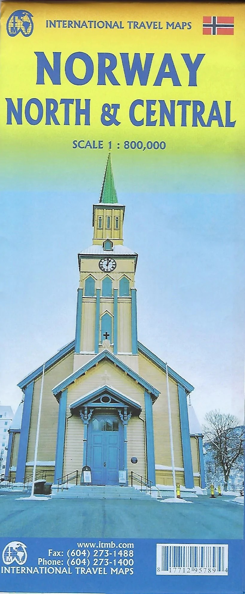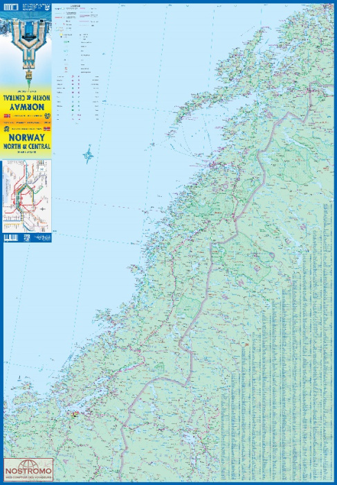 Norway is one of the more interesting countries in Europe for travellers, in that it has wide open spaces and unusual Arctic scenery, particularly in the north. Because it is a rather long and narrow country, trying to portray it adequately on a single sheet results in a lack of scale adequate for showing touristic attractions. This map covers the northern portion of the country, from Trondheim to Nordkapp and from the North Atlantic to the Russian border. It also shows a portion of northern Sweden and a bit of Finland and Russia, but its focus is on roads, rail connections, airports, distance markers, parks, and touristic attractions in the region. Most noticeably, the rail lines leading to Trondheim and north to Bodo are clearly shown. Communities, sometimes fairly small, are included, as are ferries to outlying islands close to the coast. The reverse side shows the rail line to Narvik coming in from Sweden, and all roads and towns north to the Arctic Ocean and east to the Russian border. Border crossing to Sweden/Finland are not shown, as both countries are part of the EU, but crossings to Russia are shown, albeit closed at the moment.