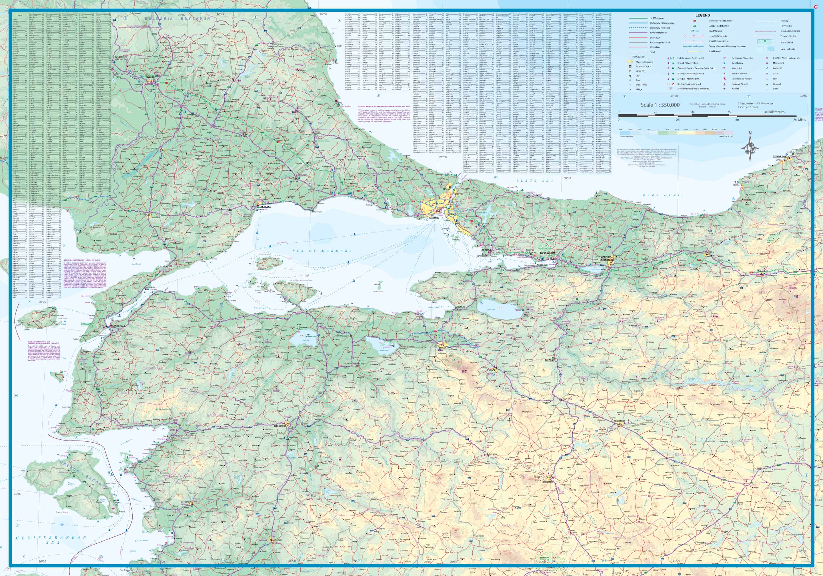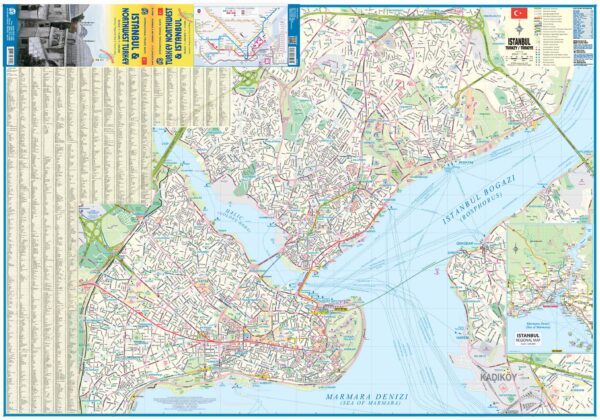 This tearproof map shows all major touristic sites, the ferry routes that criss cross the Bosphorus, and the transit lines that move everyone around the city. On the second side of the sheet, we provide a very detailed map of North-western Turkey, from the Greek and Bulgarian borders south past Cannakele and Edremit and east to Bolu.