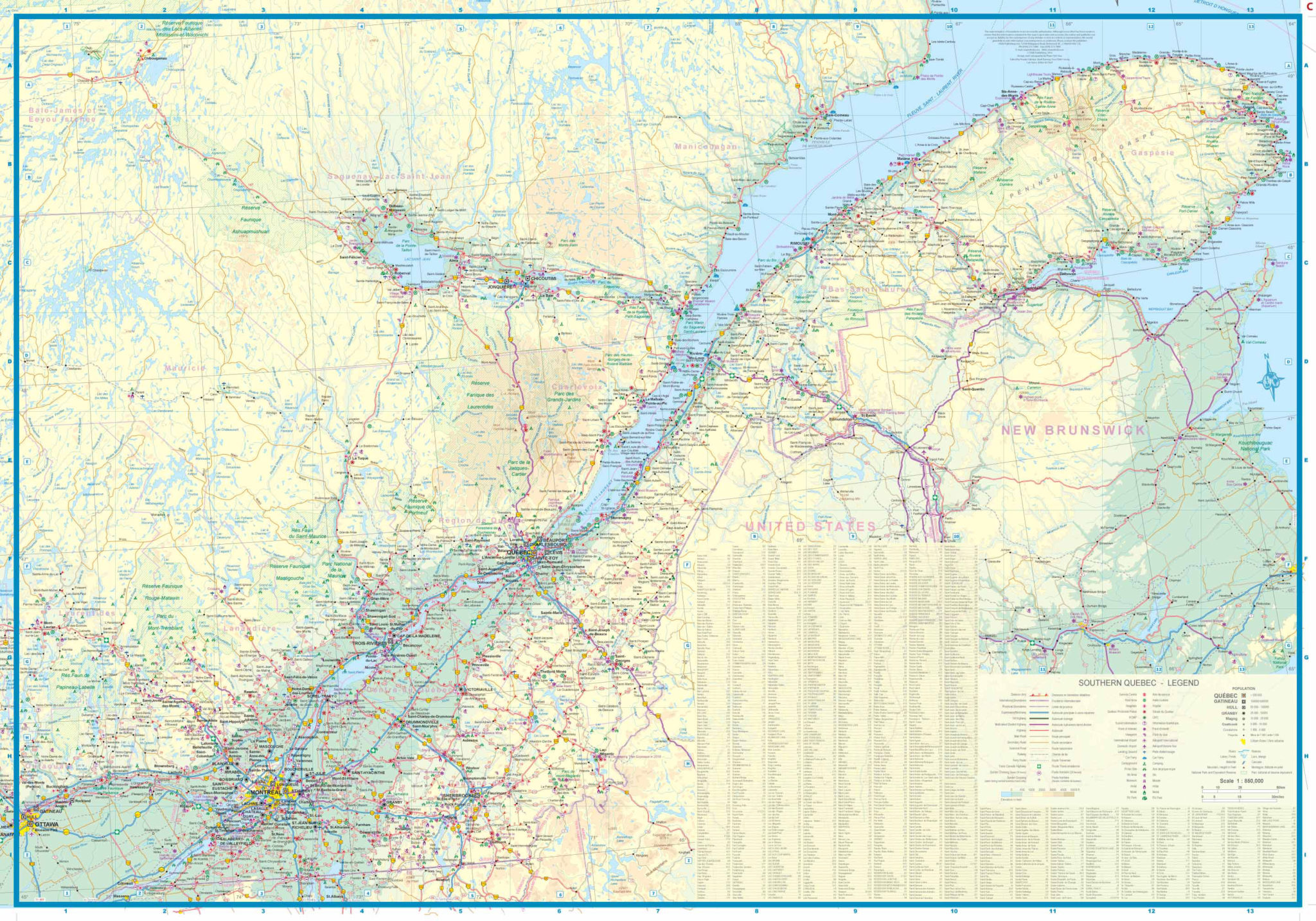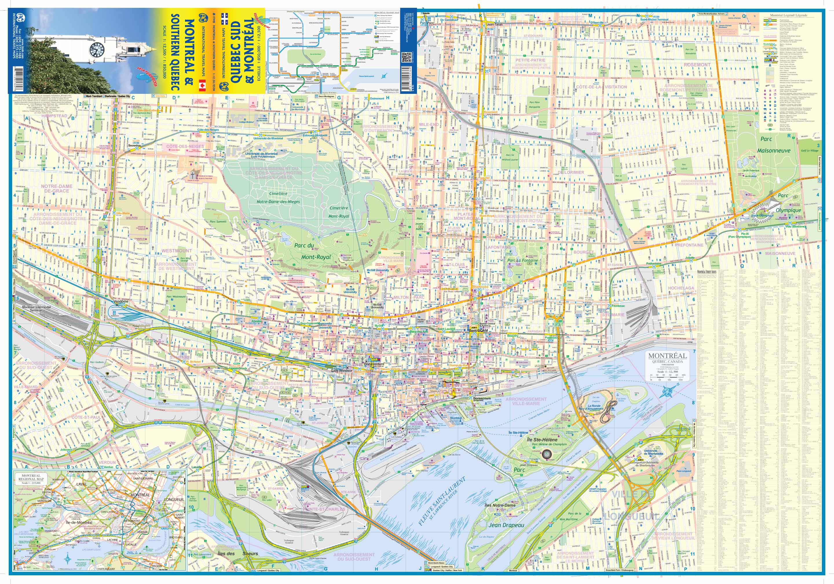 Mooie overzichts/wegenkaart van Québec met op de andere kant een stadsplattegrond van Montréal. | Montreal vies with Vancouver for being the second largest city in the country (Toronto being by far the largest). Both cities have a great cultural diversity, but Montreal's French background and bilingual nature makes it a favorite travel destination. This time, we have enhanced the map by printing it on waterproof paper, and by improving the scale used for Southern Quebec to make it more user friendly The Hinterland of Montreal, from the American and Ontario borders north into the Laurentian Mountains and east to the touristic and popular Gaspe Peninsula, makes this a popular map with visitors. With one map, visitors have all the highways of the Province of Quebec AND the streets of historic Montreal!