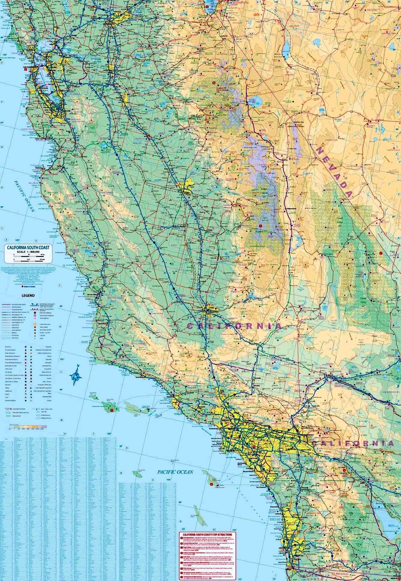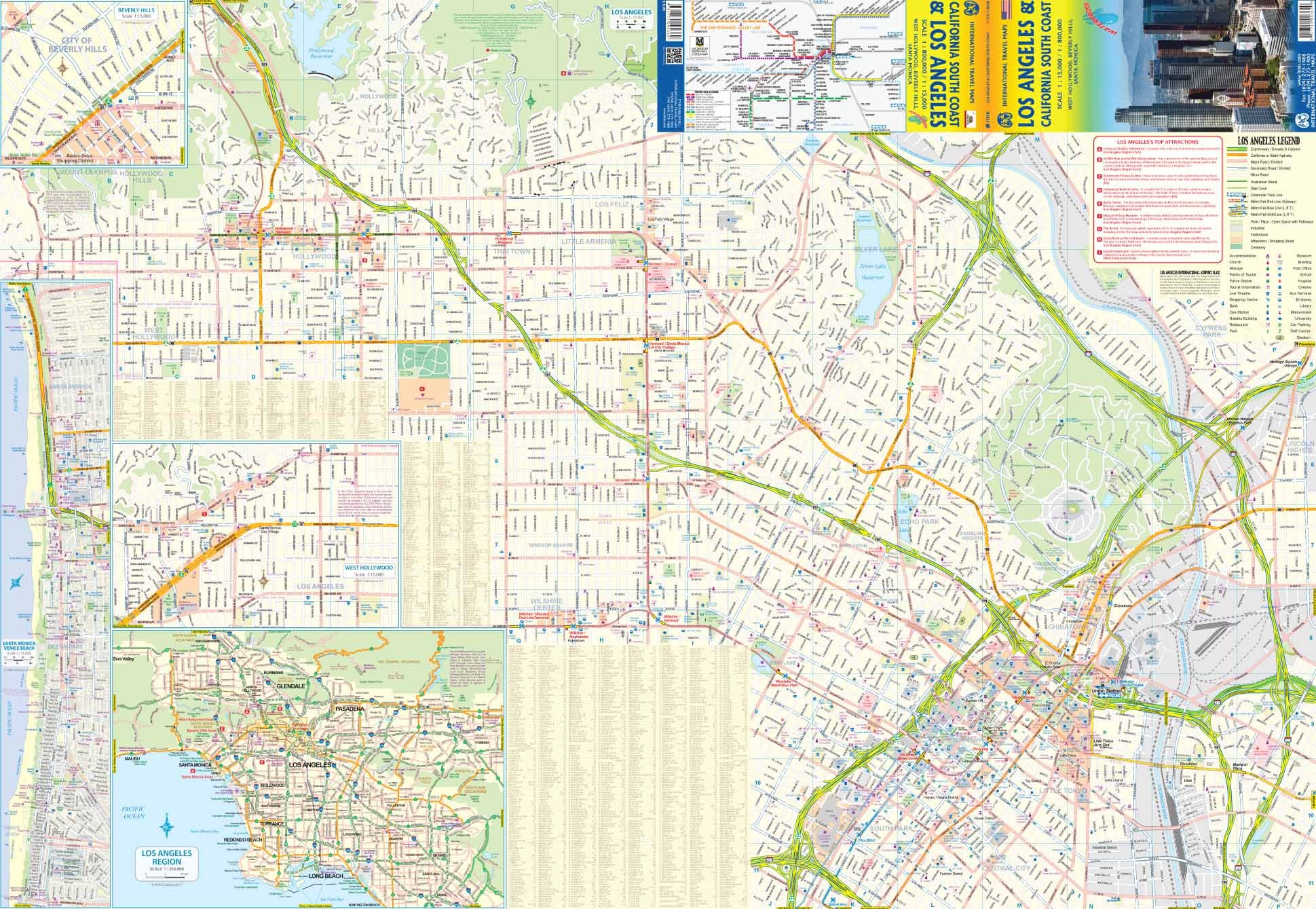 This updated version of one of America's great urban areas adds a brand new feature, the city's Top Attractions. Universal and Paramount Studios top the list, but the Hollywood Walk of Fame is probably more visited than any other sidewalk on the planet. The Santa Monica Pier and its nearby Route 66 information office are great attractions, as is Sunset Boulevard. The reverse side of the sheet covers southern California from the Mexican border north to San Francisco and east to Palm Springs noting, as usual, touristic sites such as the routes followed by Route 66, the Big Sur drive along the coast, Yosemite, and all the north-south highways from Tijuana to Sacramento. By using this one map, the buyer covers everything he'd want to see in LA and also has a map that covers driving routes for hundreds of miles. Legend Includes: Accommodation, Church, Mosque, Point of Tourist, Police Station, Tourist Information, Live Theatre, Shopping Centre, Bank, Gas Station, Notable Building, Restaurant, Park, etc,.