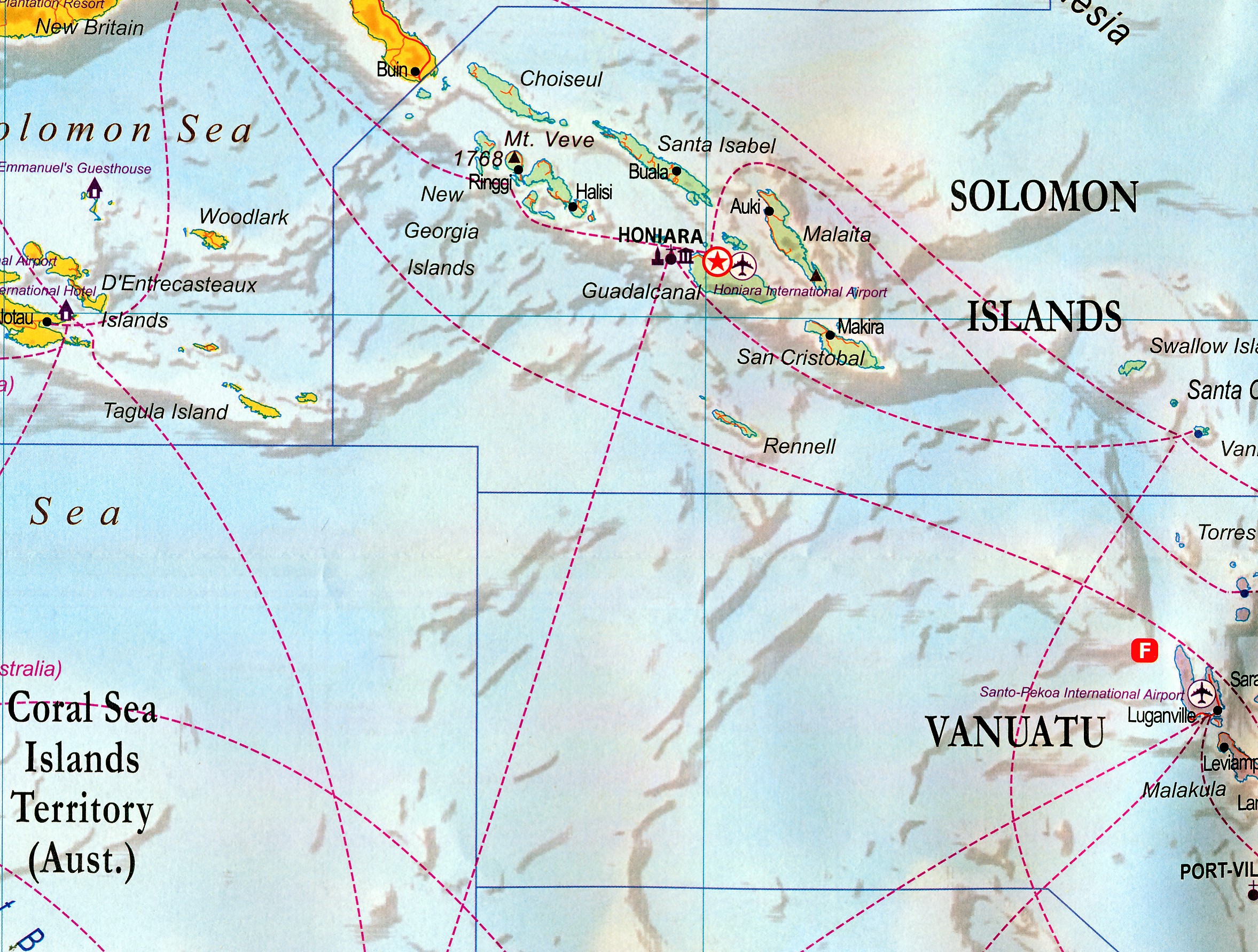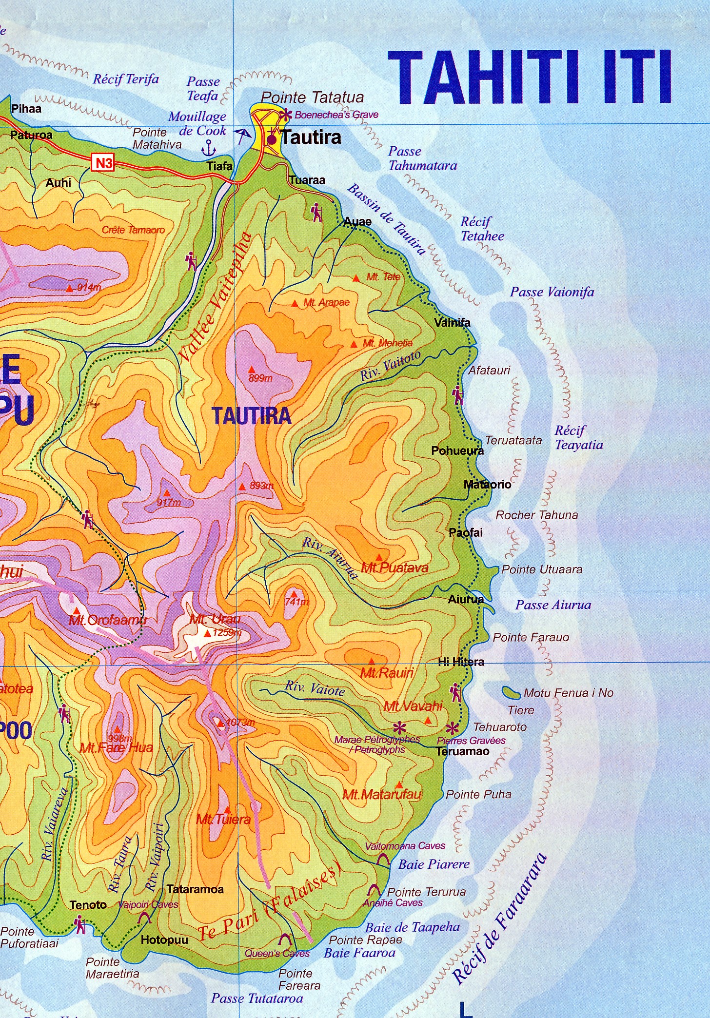 Een fraaie gedetailleerde overzichtskaart van Tahiti en de Cookeilanden. Bevat aanduidingen van o.a. nationale parken, vliegveld, tankstations, onverharde wegen en een stadsplattegrondje van de hoofdstad.