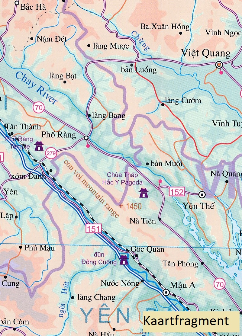 Fraaie, relatief gedetailleerde overzichtskaart over heel Vietnam. Met plattegronden van de belangrijkste plaatsen. Toont het wegennet, steden en dorpen, bergen en rivieren. Symbolen voor interessante plaatsen en bezienswaardigheden.