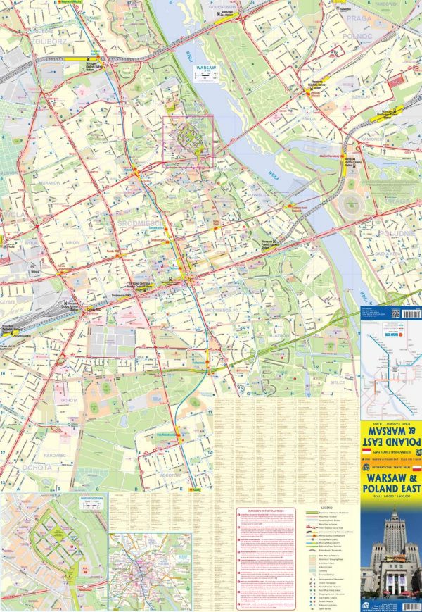 Een bijgewerkte kaart van Warschau (2018) en aan de andere kant van deze dubbelzijdig bedrukte kaart een kaart van de oostelijke helft van Polen. Het oude centrum van Warschau is eigenlijk vrij compact, dus is in detail weergegeven op een kaartje, net als een inzet van de gehele agglomeratie. De stadsplattegrond toont spoor- en metrolijnen/stations, tramlijnen, kerken, theaters, het enorme culturele centrum uit het Sovjettijdperk, hotels, enz. De andere zijde beslaat geheel Oost-Polen, van de oostelijke grenzen tot Lodz, en omvat de wegen die naar Krakau en Gdansk leiden; al met al een perfecte kaart voor degenen die Warschau als uitvalsbasis gebruiken en het achterland op korte reizen verkennen.