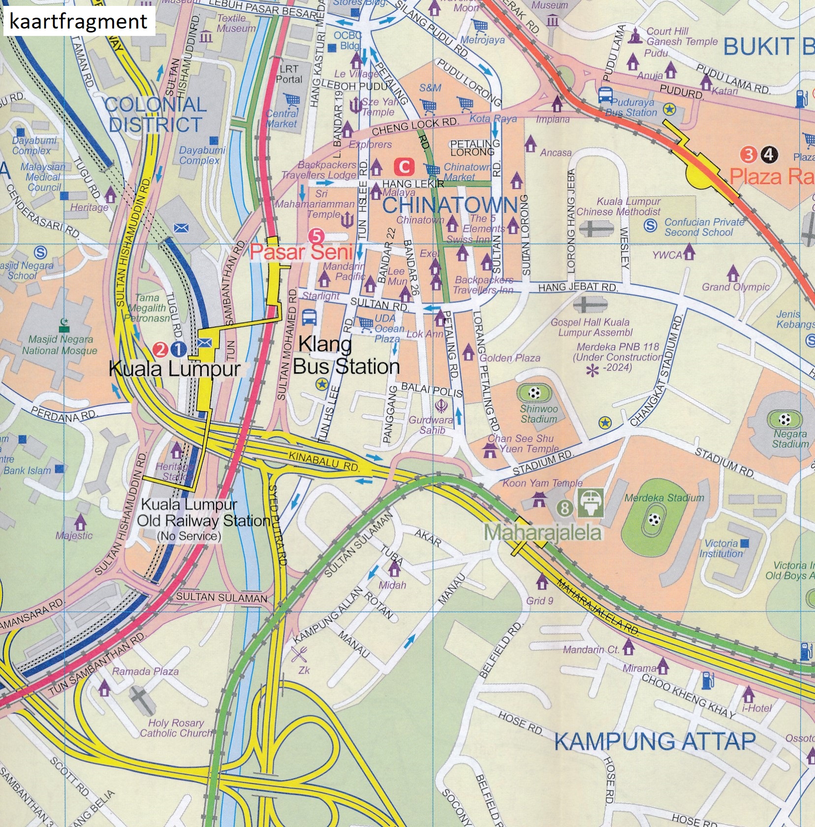 Mooie en relatief gedetailleerde overzichtskaart / wegenkaart van West-Maleisië (het schiereiland). Op de achterkant een stadsplattegrond van Kuala Lumpur: ... 'covering the city from the Sentul Terminal and the Setapak Park in the north to the Chinese Cemetery in the south, and from the Parliament House (Bangunan Paliament) in the west to the Royal Selangor Golf Club in the east.Two insets show the Kuala Lumpur surroundings at 1:437,000 and a map of the Kuala Lumpur Transit system (metro, railway, mono-rail and inter-city rail lines).Detail includes markets, notable and public buildings, shopping malls, various religious buidings, accommodation, museums, theatres and cinemas, points of interest, post offices and police stations, bus terminals. Various railway systems and pedestrian roads are also indicated alongside land use, e.g. parks, markets, industrial areas, attractions, etc.Includes an extensive index of place names.'.