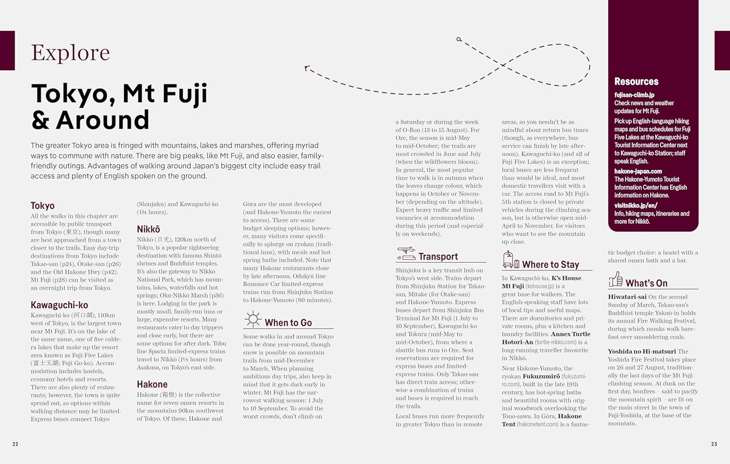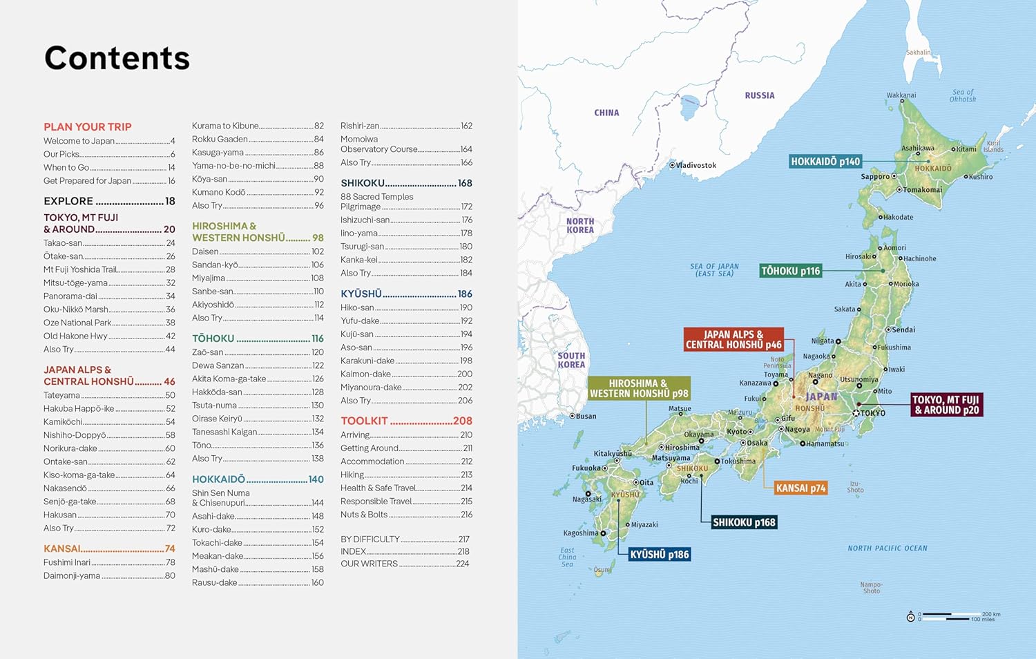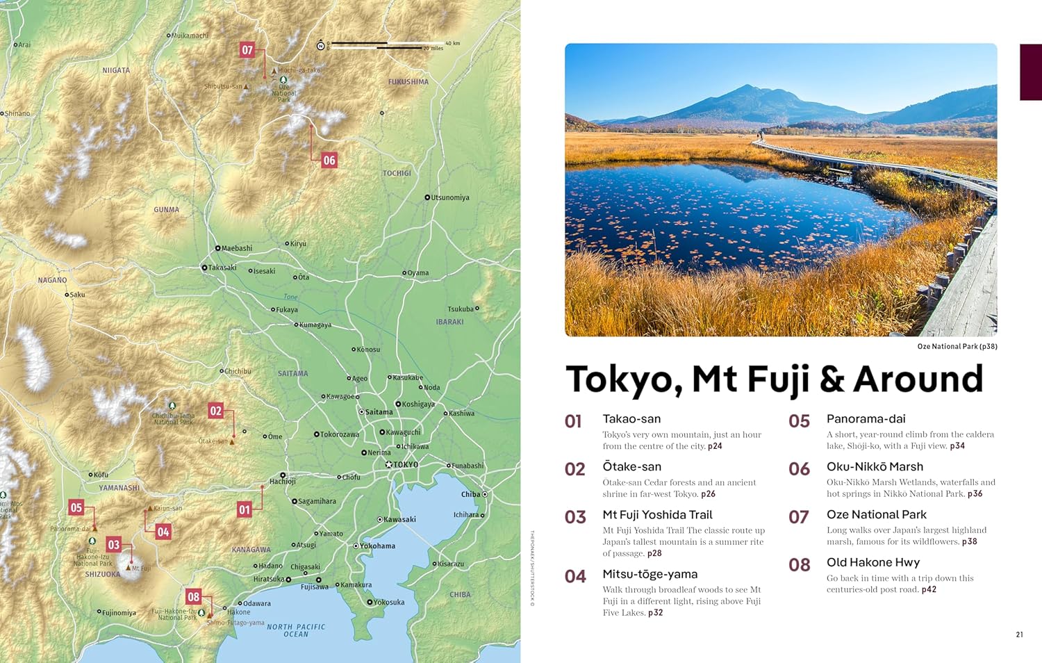 - Speciale hoofdstukken over de hoogtepunten van Japan voor wandelaars, kindvriendelijke wandelingen, toegankelijke paden en wat mee te nemen. De Best voor ... sectie helpt u bij het plannen van uw reis en selecteert u wandelingen die een beroep op uw interesses. Regio profielen gaan over wanneer te gaan, waar te verblijven, wat er te doen is, culturele inzichten, en sw lokale keuken (en waar die te genieten). Aanbevolen regio's zijn onder andere: Tokio, Mt Fuji & omgeving, Japanse Alpen & Centraal Honshu, Kansai, Hiroshima & West Honshu, Tohoku, Hokkaido, Shikoku, Kyushu